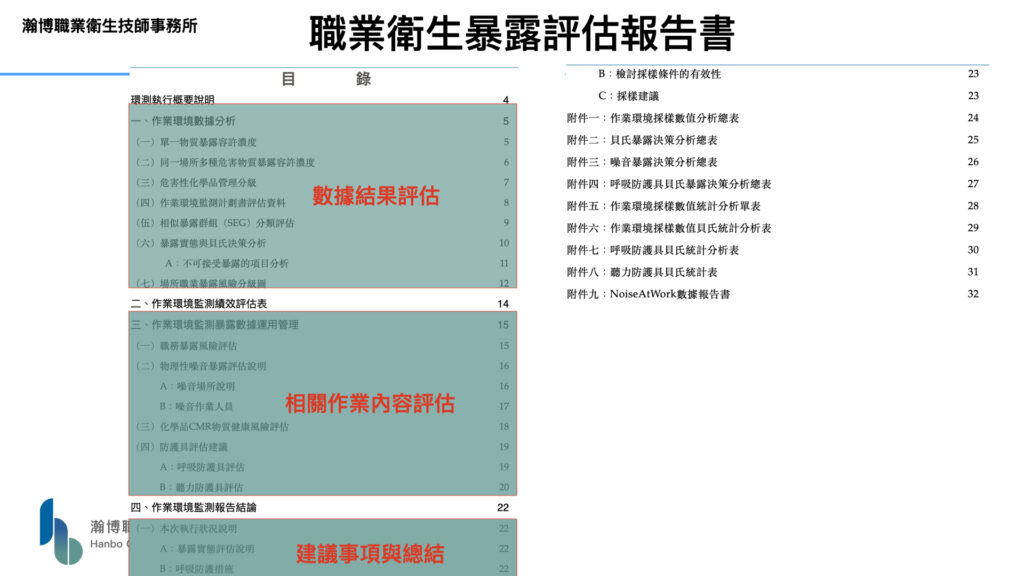 針對這個部分如果事業單位願意提供相關資料,我們可以提供一次免費的單一使用的化學產品的暴露評估(此部份僅限事業單位),事業單位可以依照我們所製作的職業衛生暴露評估內容進行審視確認是否符合貴公司的期望,之後再決定是否需要委託本事務所,而費用的部份也可以依照貴公司的需求進行調整執行範圍的大小。