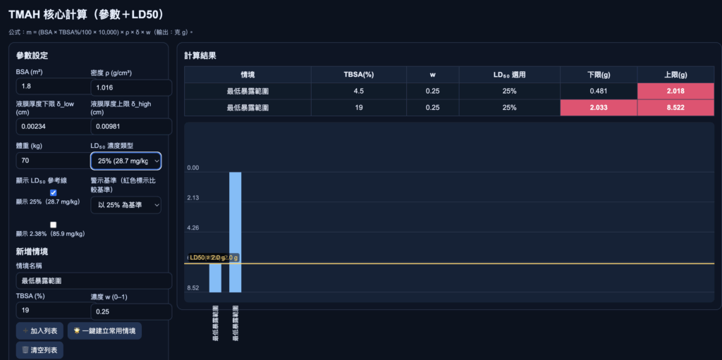 立即使用我們設計的【TMAH 噴濺量風險評估工具】,快速模擬濃度 × 面積 × LD50 致死風險!